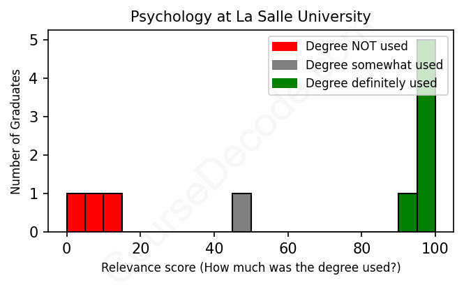 The verdict? Slightly below average. Overall, with an average relevance score of 64%, Psychology graduates from La Salle University have a slightly lower likelihood (-3%) of finding work in this field compared to the average graduate across all fields: