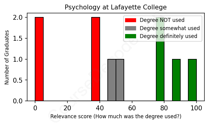 The verdict? Significantly below average. Overall, with an average relevance score of 51%, Psychology graduates from Lafayette College have a much lower likelihood (-16%) of finding work in this field compared to the average graduate across all fields: