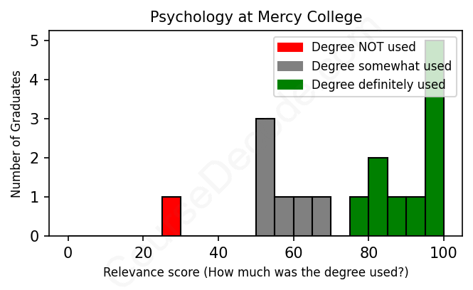 The verdict? Above average. Overall, with an average relevance score of 75%, Psychology graduates from Mercy College have a higher likelihood (+8%) of finding work in this field compared to the average graduate across all fields: