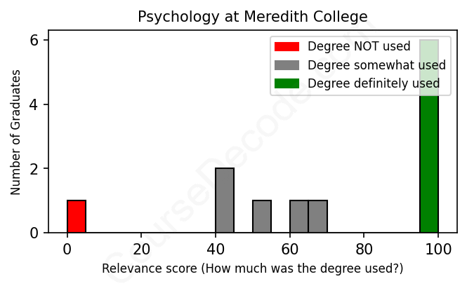The verdict? Slightly above average. Overall, with an average relevance score of 71%, Psychology graduates from Meredith College have a slightly higher likelihood (+4%) of finding work in this field compared to the average graduate across all fields: