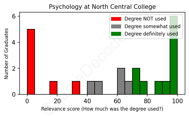The verdict? Below average. Overall, with an average relevance score of 57%, Psychology graduates from North Central College have a lower likelihood (-10%) of finding work in this field compared to the average graduate across all fields: