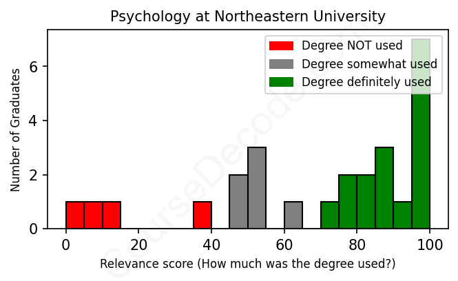 The verdict? Slightly above average. Overall, with an average relevance score of 69%, Psychology graduates from Northeastern University have a slightly higher likelihood (+2%) of finding work in this field compared to the average graduate across all fields: