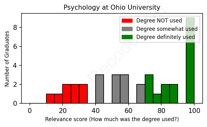The verdict? Slightly below average. Overall, with an average relevance score of 64%, Psychology graduates from Ohio University have a slightly lower likelihood (-3%) of finding work in this field compared to the average graduate across all fields: