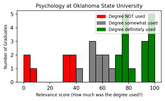 The verdict? Slightly below average. Overall, with an average relevance score of 63%, Psychology graduates from Oklahoma State University have a slightly lower likelihood (-4%) of finding work in this field compared to the average graduate across all fields: