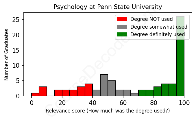 The verdict? Slightly above average. Overall, with an average relevance score of 68%, Psychology graduates from Penn State University have a slightly higher likelihood (+1%) of finding work in this field compared to the average graduate across all fields: