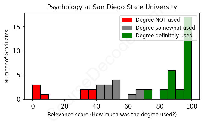 The verdict? Slightly above average. Overall, with an average relevance score of 70%, Psychology graduates from San Diego State University have a slightly higher likelihood (+3%) of finding work in this field compared to the average graduate across all fields: