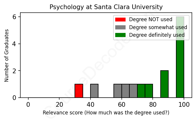 The verdict? Significantly above average. Overall, with an average relevance score of 78%, Psychology graduates from Santa Clara University have a much higher likelihood (+11%) of finding work in this field compared to the average graduate across all fields: