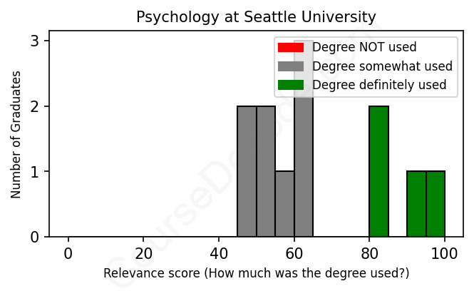 The verdict? Slightly below average. Overall, with an average relevance score of 66%, Psychology graduates from Seattle University have a slightly lower likelihood (-1%) of finding work in this field compared to the average graduate across all fields: