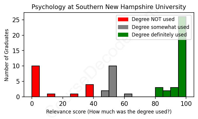 The verdict? Slightly below average. Overall, with an average relevance score of 65%, Psychology graduates from Southern New Hampshire University have a slightly lower likelihood (-2%) of finding work in this field compared to the average graduate across all fields:
