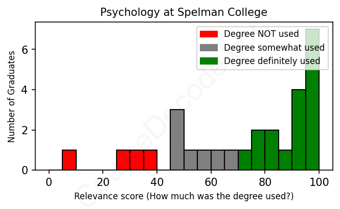 The verdict? Slightly above average. Overall, with an average relevance score of 72%, Psychology graduates from Spelman College have a slightly higher likelihood (+5%) of finding work in this field compared to the average graduate across all fields: