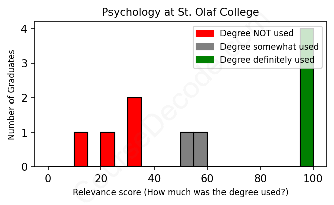 The verdict? Below average. Overall, with an average relevance score of 61%, Psychology graduates from St. Olaf College have a lower likelihood (-6%) of finding work in this field compared to the average graduate across all fields: