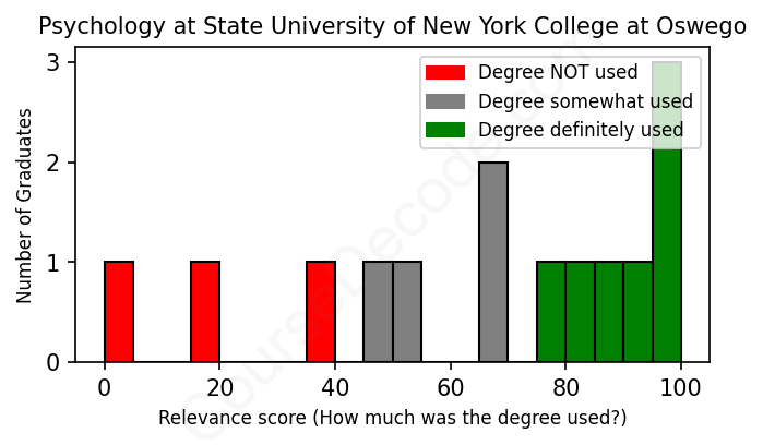The verdict? Slightly below average. Overall, with an average relevance score of 66%, Psychology graduates from State University of New York College at Oswego have a slightly lower likelihood (-1%) of finding work in this field compared to the average graduate across all fields: