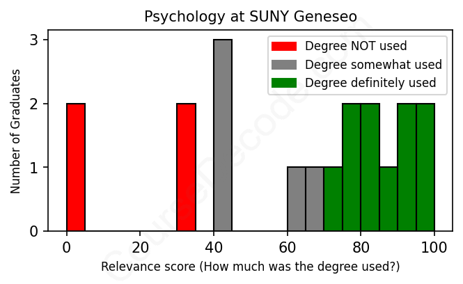 The verdict? Slightly below average. Overall, with an average relevance score of 62%, Psychology graduates from SUNY Geneseo have a slightly lower likelihood (-5%) of finding work in this field compared to the average graduate across all fields:
