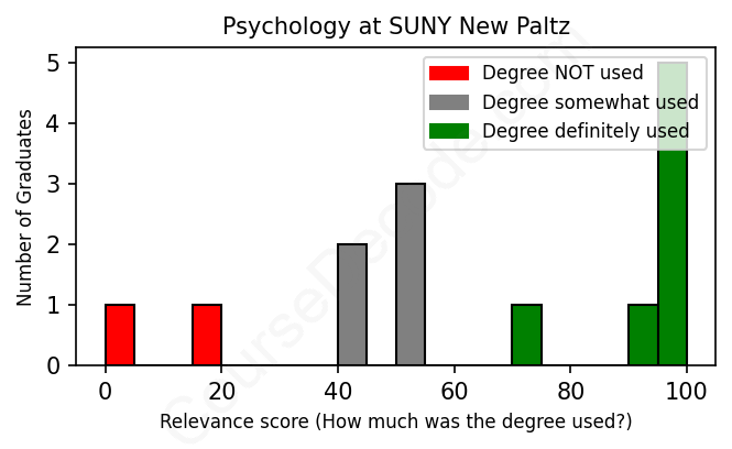 The verdict? Slightly below average. Overall, with an average relevance score of 64%, Psychology graduates from SUNY New Paltz have a slightly lower likelihood (-3%) of finding work in this field compared to the average graduate across all fields: