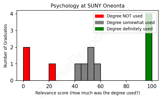 The verdict? Significantly below average. Overall, with an average relevance score of 55%, Psychology graduates from SUNY Oneonta have a much lower likelihood (-12%) of finding work in this field compared to the average graduate across all fields: