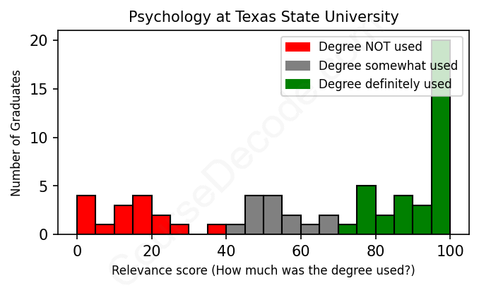 The verdict? Slightly below average. Overall, with an average relevance score of 64%, Psychology graduates from Texas State University have a slightly lower likelihood (-3%) of finding work in this field compared to the average graduate across all fields: