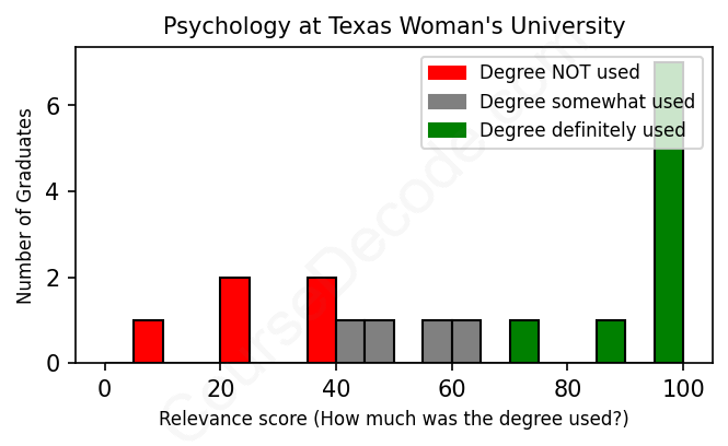 The verdict? Slightly below average. Overall, with an average relevance score of 65%, Psychology graduates from Texas Woman's University have a slightly lower likelihood (-2%) of finding work in this field compared to the average graduate across all fields: