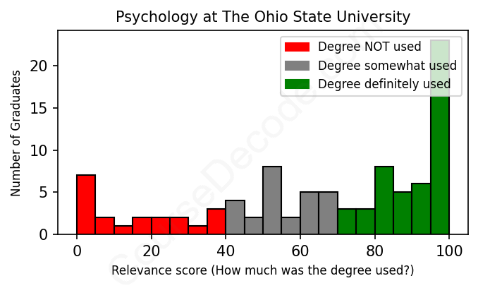 The verdict? Slightly below average. Overall, with an average relevance score of 64%, Psychology graduates from The Ohio State University have a slightly lower likelihood (-3%) of finding work in this field compared to the average graduate across all fields: