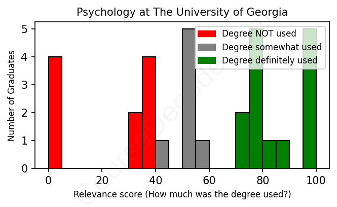 The verdict? Significantly below average. Overall, with an average relevance score of 56%, Psychology graduates from The University of Georgia have a much lower likelihood (-11%) of finding work in this field compared to the average graduate across all fields: