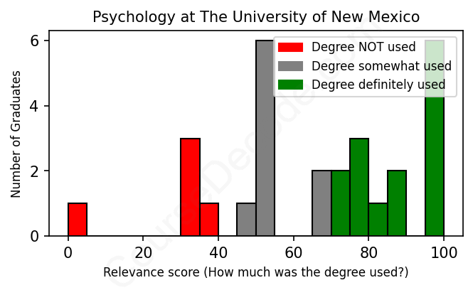 The verdict? Slightly below average. Overall, with an average relevance score of 66%, Psychology graduates from The University of New Mexico have a slightly lower likelihood (-1%) of finding work in this field compared to the average graduate across all fields: