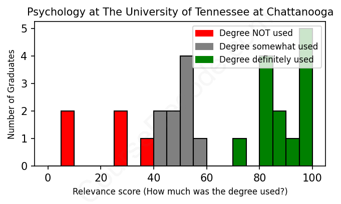 The verdict? Slightly below average. Overall, with an average relevance score of 63%, Psychology graduates from The University of Tennessee at Chattanooga have a slightly lower likelihood (-4%) of finding work in this field compared to the average graduate across all fields: