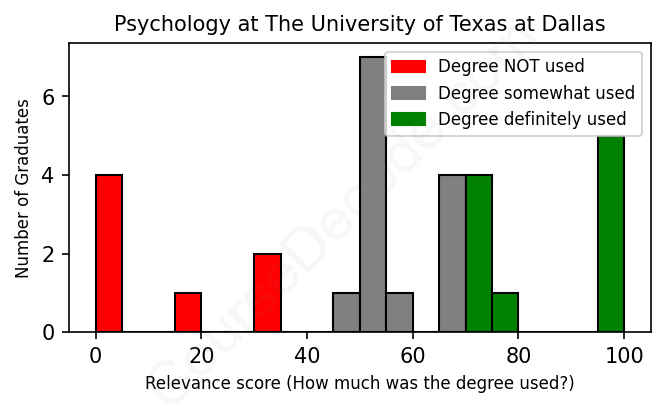 The verdict? Significantly below average. Overall, with an average relevance score of 55%, Psychology graduates from The University of Texas at Dallas have a much lower likelihood (-12%) of finding work in this field compared to the average graduate across all fields: