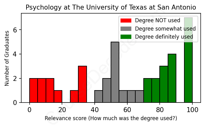 The verdict? Below average. Overall, with an average relevance score of 59%, Psychology graduates from The University of Texas at San Antonio have a lower likelihood (-8%) of finding work in this field compared to the average graduate across all fields: