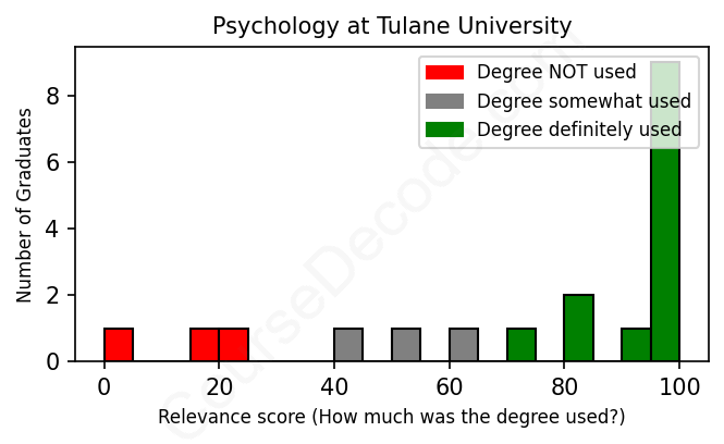The verdict? Above average. Overall, with an average relevance score of 75%, Psychology graduates from Tulane University have a higher likelihood (+8%) of finding work in this field compared to the average graduate across all fields: