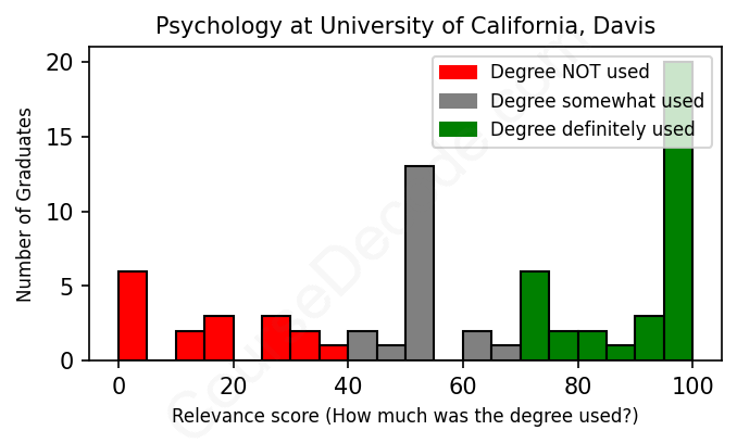 The verdict? Slightly below average. Overall, with an average relevance score of 62%, Psychology graduates from University of California, Davis have a slightly lower likelihood (-5%) of finding work in this field compared to the average graduate across all fields: