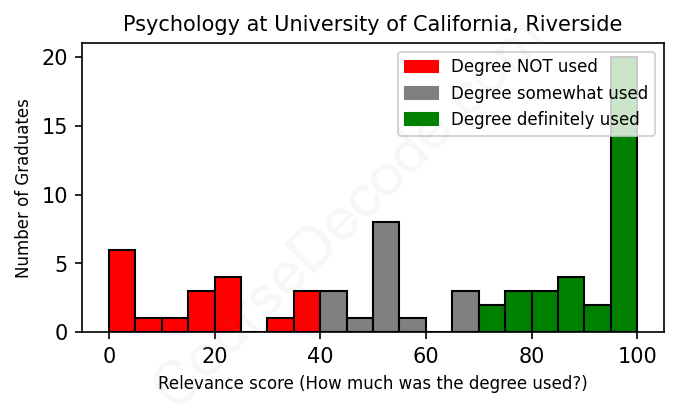 The verdict? Slightly below average. Overall, with an average relevance score of 62%, Psychology graduates from University of California, Riverside have a slightly lower likelihood (-5%) of finding work in this field compared to the average graduate across all fields: