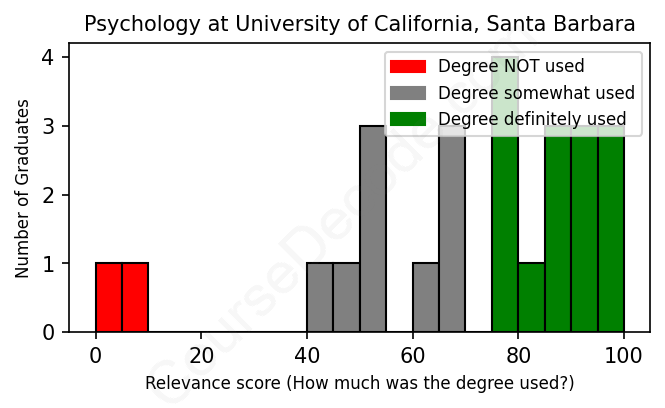 The verdict? Slightly above average. Overall, with an average relevance score of 69%, Psychology graduates from University of California, Santa Barbara have a slightly higher likelihood (+2%) of finding work in this field compared to the average graduate across all fields: