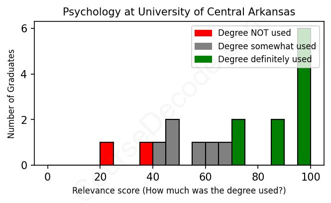The verdict? Slightly above average. Overall, with an average relevance score of 71%, Psychology graduates from University of Central Arkansas have a slightly higher likelihood (+4%) of finding work in this field compared to the average graduate across all fields:
