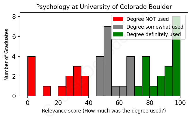 The verdict? Below average. Overall, with an average relevance score of 58%, Psychology graduates from University of Colorado Boulder have a lower likelihood (-9%) of finding work in this field compared to the average graduate across all fields: