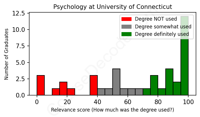 The verdict? Slightly below average. Overall, with an average relevance score of 65%, Psychology graduates from University of Connecticut have a slightly lower likelihood (-2%) of finding work in this field compared to the average graduate across all fields: