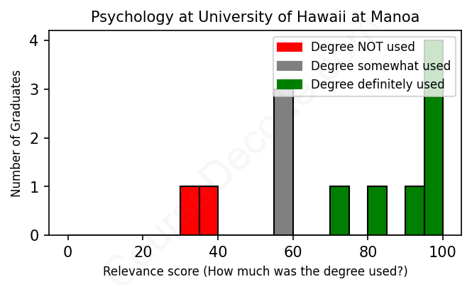 The verdict? Above average. Overall, with an average relevance score of 74%, Psychology graduates from University of Hawaii at Manoa have a higher likelihood (+7%) of finding work in this field compared to the average graduate across all fields: