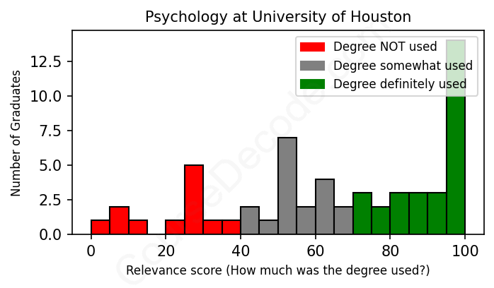 The verdict? Slightly below average. Overall, with an average relevance score of 65%, Psychology graduates from University of Houston have a slightly lower likelihood (-2%) of finding work in this field compared to the average graduate across all fields: