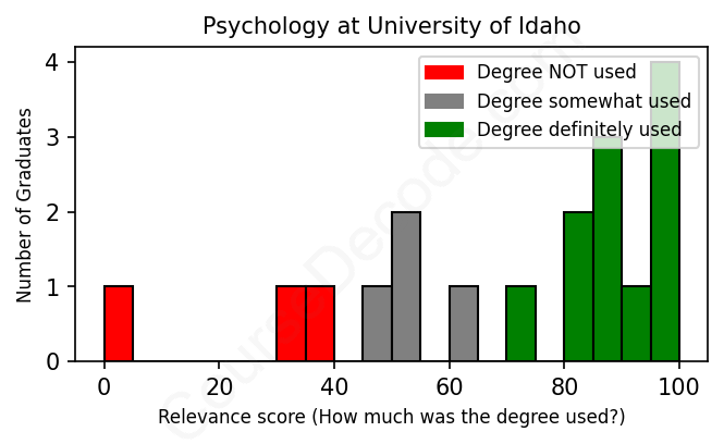 The verdict? Slightly above average. Overall, with an average relevance score of 70%, Psychology graduates from University of Idaho have a slightly higher likelihood (+3%) of finding work in this field compared to the average graduate across all fields: