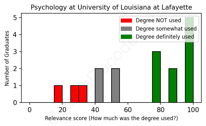 The verdict? Slightly above average. Overall, with an average relevance score of 68%, Psychology graduates from University of Louisiana at Lafayette have a slightly higher likelihood (+1%) of finding work in this field compared to the average graduate across all fields: