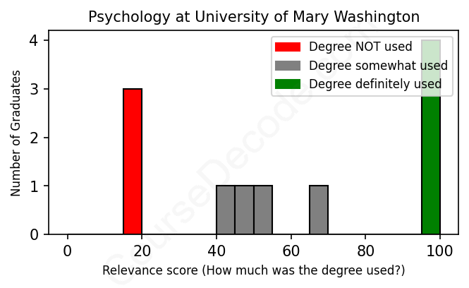 The verdict? Below average. Overall, with an average relevance score of 59%, Psychology graduates from University of Mary Washington have a lower likelihood (-8%) of finding work in this field compared to the average graduate across all fields: