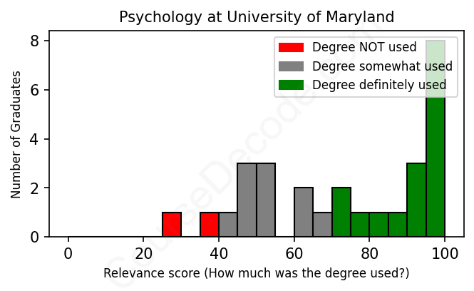The verdict? Above average. Overall, with an average relevance score of 73%, Psychology graduates from University of Maryland have a higher likelihood (+6%) of finding work in this field compared to the average graduate across all fields:
