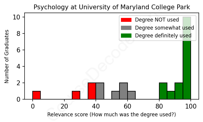 The verdict? Above average. Overall, with an average relevance score of 73%, Psychology graduates from University of Maryland College Park have a higher likelihood (+6%) of finding work in this field compared to the average graduate across all fields: