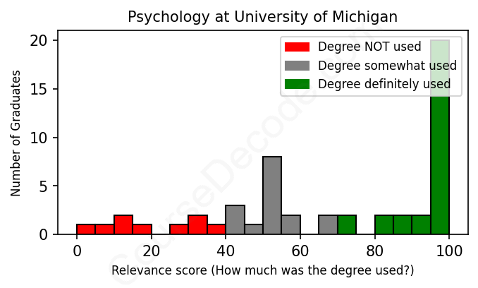 The verdict? Slightly above average. Overall, with an average relevance score of 68%, Psychology graduates from University of Michigan have a slightly higher likelihood (+1%) of finding work in this field compared to the average graduate across all fields: