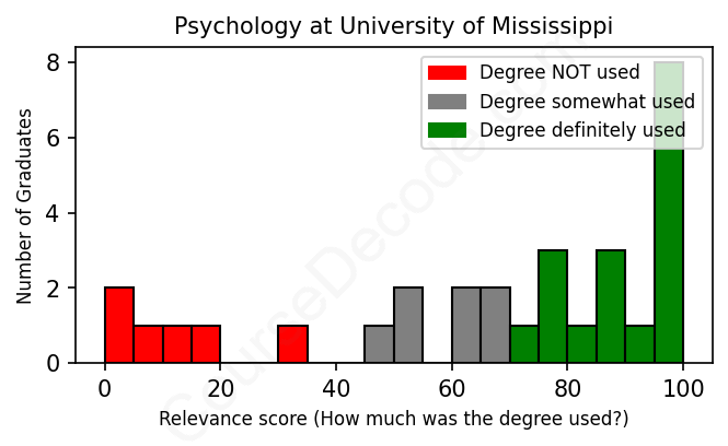 The verdict? On par with the average. Overall, with an average relevance score of 67%, Psychology graduates from University of Mississippi have about the same likelihood of finding work in this field as the average graduate across all fields: