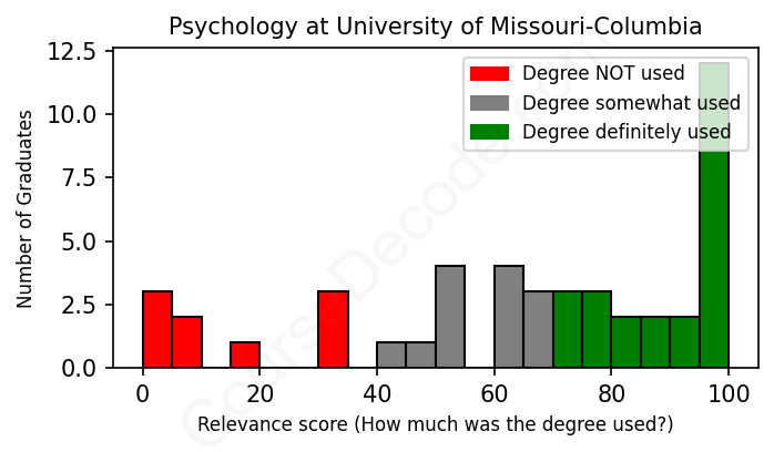 The verdict? Slightly below average. Overall, with an average relevance score of 65%, Psychology graduates from University of Missouri-Columbia have a slightly lower likelihood (-2%) of finding work in this field compared to the average graduate across all fields: