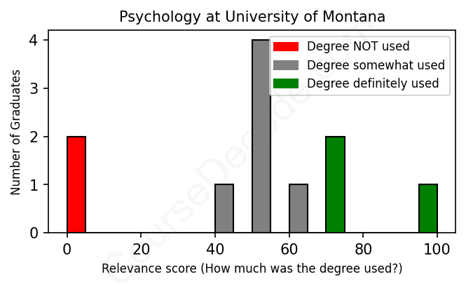 The verdict? Significantly below average. Overall, with an average relevance score of 50%, Psychology graduates from University of Montana have a much lower likelihood (-17%) of finding work in this field compared to the average graduate across all fields: