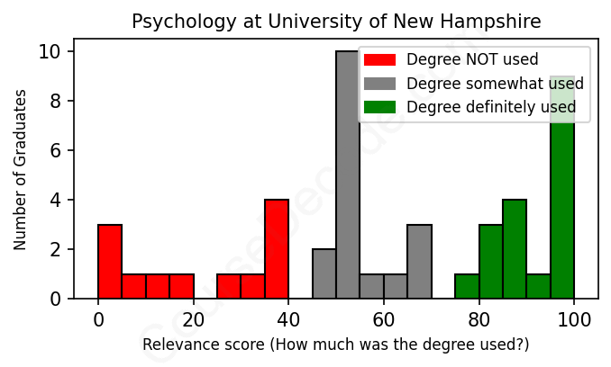 The verdict? Below average. Overall, with an average relevance score of 60%, Psychology graduates from University of New Hampshire have a lower likelihood (-7%) of finding work in this field compared to the average graduate across all fields: