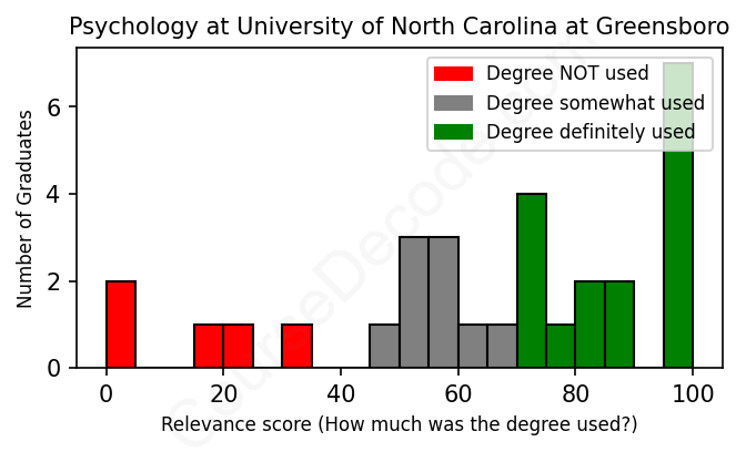 The verdict? Slightly below average. Overall, with an average relevance score of 66%, Psychology graduates from University of North Carolina at Greensboro have a slightly lower likelihood (-1%) of finding work in this field compared to the average graduate across all fields: