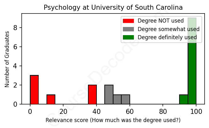 The verdict? Slightly below average. Overall, with an average relevance score of 63%, Psychology graduates from University of South Carolina have a slightly lower likelihood (-4%) of finding work in this field compared to the average graduate across all fields: