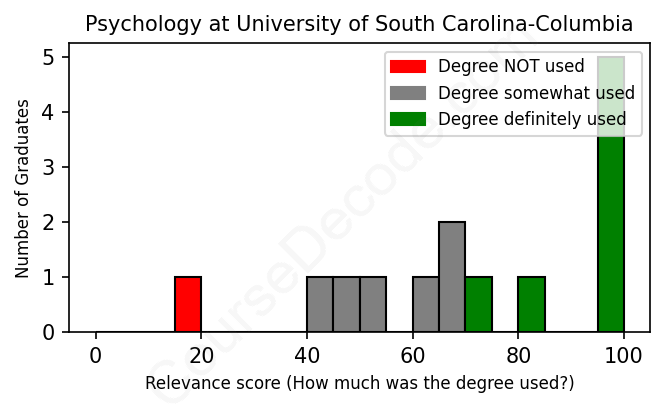 The verdict? Slightly above average. Overall, with an average relevance score of 71%, Psychology graduates from University of South Carolina-Columbia have a slightly higher likelihood (+4%) of finding work in this field compared to the average graduate across all fields:
