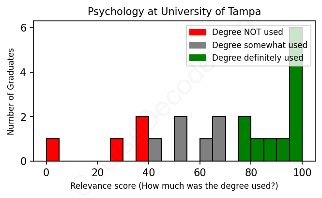 The verdict? Slightly above average. Overall, with an average relevance score of 69%, Psychology graduates from University of Tampa have a slightly higher likelihood (+2%) of finding work in this field compared to the average graduate across all fields:
